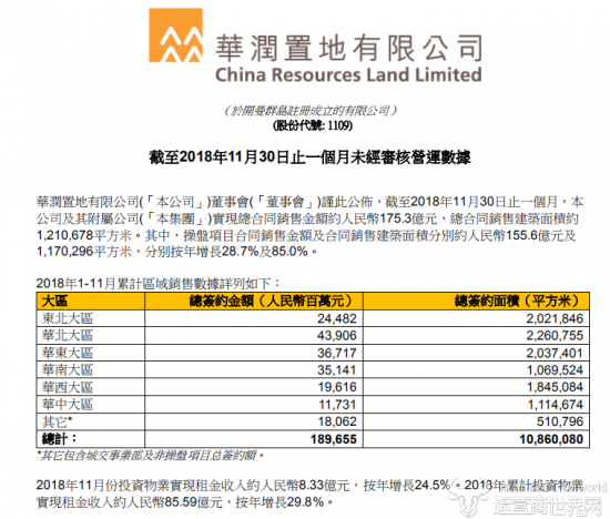 今日,华润置地有限公司(以下简称为“华润置地”)发布了今年11月的销售简报。