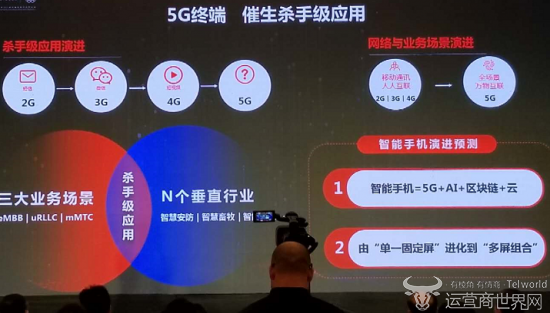 他表示5G终端先行不仅可以使消费类市场呈现滚雪球效应,还可以使行业类产业呈现脉冲效应。5G终端催生了杀手级应用的产生,从2G的短信、3G的微信、4G的短视频,5G将会出现什么应用呢?这个问题需要思考,但肯定是杀手级的应用,会从三大业务场景和N个垂直行业中繁衍出来。