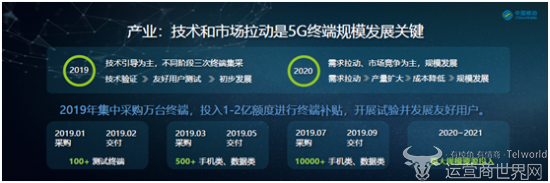 汪恒江表示,技术和市场拉动是5G终端规模发展的关键。其中,2019年将以技术引导为主,进行不同阶段三次终端集采,主要分为技术验证、友好用户测试、初步发展这三阶段。而2020年5G终端将会是以需求拉动、市场竞争为主,需求拉动会带动产量扩大和成本降低,最终形成规模发展。