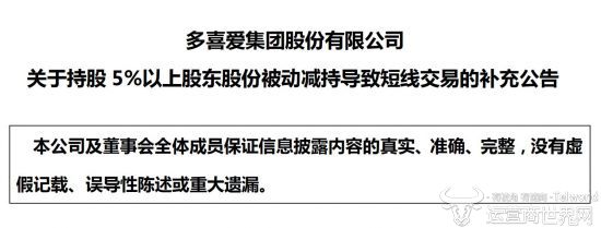 日前,多喜爱集团股份有限公司(简称“多喜爱”)发布了关于持股5%以上股东股份被动减持导致短线交易的补充公告。
