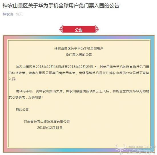 神农山景区关于华为手机全球用户免门票入园的公告: