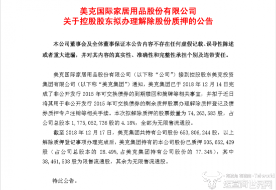12月18日,美克国际家居用品股份有限公司发布关于控股股东美克投资集团有限公司拟办理解除股份质押的公告。