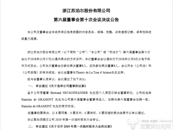 公告显示,苏泊尔董事会审议通过《关于选举公司董事的议案》,鉴于公司原董事 Bertrand NEUSCHWANDER 先生因个人原因已辞去董事职位,公司拟选举Stanislas de GRAMONT 先生为公司第六届董事会董事候选人,任期与第六届董事会任期一致。