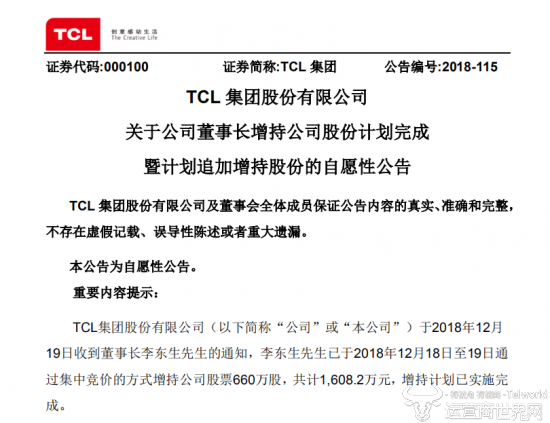 12月19日,TCL集团发布了关于关于公司董事长增持公司股份计划完成暨计划追加增持股份的自愿性公告。公告显示,TCL董事长李东生自公告披露之日起十五个交易日内,通过集中竞价方式追加增持公司股份,目标增持金额为人民币2500万。
