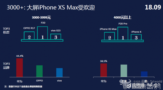 在整个报告中,有一个点引起了运营商世界网的注意。那就是在4000元以上的机型价位段上,华为包揽了前三名,产品机型分别为华为Mate 20 Pro、华为Mate 20以及华为P20 Pro。