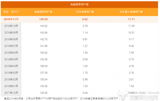 在有线宽带方面,中国电信11月有线宽带用户新增62万户,累计1.4524亿户。值得注意的是,截至2018年9月底,中国电信光纤宽带用户数达到约1.3862亿户,2018年首三季度净增约1245万户。
