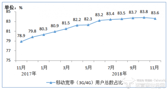 图3 2017年11月末-2018年11月末移动宽带用户总数占比情况