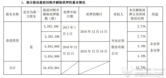 截至公告披露日,奋进投资持有公司股份约为1.21亿股,占公司总股本的13.72%。其所持有公司股份累计被质押的股份数量约为0.54亿股,占其所持公司股份数的44.74%,占公司总股本的 6.14%。
