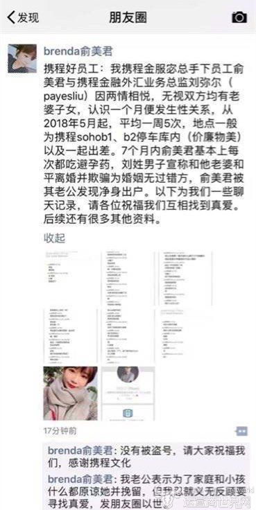根据爆料截图内容,一名为“brenda”的爆料人在微信朋友圈爆料称,携程金服宓总手下员工愈美君,与携程金融外汇总监刘弥尔(payesliu)因两情相悦,五十双方均有老婆子女,认识一个月便发生性关系。从2018年5月起,平均一周5次,地点一般为携程sohob1、b2停车库内(价廉物美)以及一起出差。7个月内,愈美君基本上每次都吃避孕药,刘姓男子宣称和他老婆和平离婚,并欺骗为婚姻无过错方,愈美君被其老公发现净身出户。以下为我们一些聊天记录,请各位祝福我们互相找到真爱。后续还有很多其他资料。”