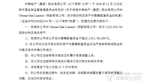 公告显示, 2018年 12 月 25日收到中国证券监督管理委员会核发《关于核准中粮地产(集团)股份有限公司向Vibrant Oak Limited(明毅有限公司)发行股份购买资产并募集配套资金的批复》,核准中粮地产发行约21亿股股份购买相关资产,非公开发行募集配套资金不超过约 24亿元。