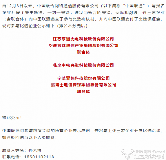 公告显示,江苏亨通光电与华通誉球通信产业集团联合体、北京中电兴发科技、宁波亚锦科技与鹏博士电信传媒联合体三家企业向中国联通递交了参与比选确认书,并向中国联通支付了比选保证金。中国联通接下来将与这三家企业开展比选洽谈。