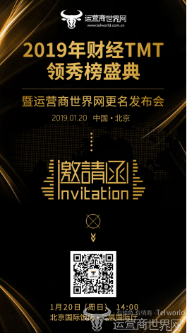 今日消息,2019年财经TMT领秀榜盛典邀请函曝光,将于2019年1月20日在北京举行。此次盛会由知名TMT行业媒体运营商世界网举办,同时运营商世界网将在会上宣布更名的结果。
