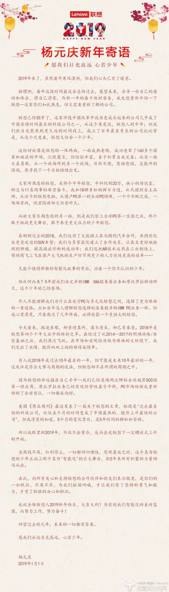 2019年1月1日,联想集团董事长杨元庆发表了对联想人的新年寄语。在新年寄语中,杨元庆总结了联想过去的发展成绩并对未来做出了展望。