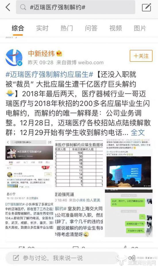 而对于强制解约原因,迈瑞医疗回复称,新员工尤其是应届毕业生短期内无法胜任和匹配业务需要,2019年,迈瑞保持优质经营的责任比往年重大,为保障公司持续稳健发展,不得不做出解约部分学生的决定,为此深感抱歉。