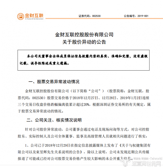 近日,受权健事件及束昱辉的影响,金财互联控股股份有限公司股票交易价格于12月27日、28日、1月2日连续三个交易日股价异常波动,收盘价格跌幅偏离值累计超过20%。