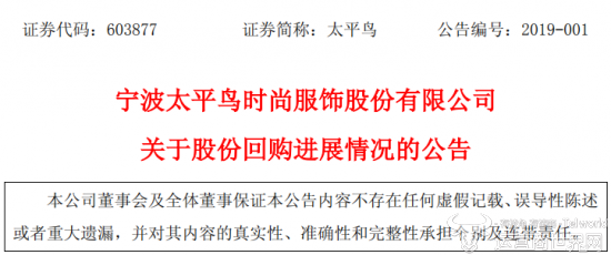 公告显示,自2018年12月19日起,太平鸟通过集中竞价交易方式实施了首次回购股份。随后,截至2019年1月2日,太平鸟通过集中竞价交易方式累计已回购股份数量为192.0316万股,占公司总股本(48075.93万股)的比例为0.3994%。