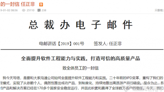任正非在信中感慨道“二十年前的IPD变革,重构了我们的研发模式,实现了从依赖个人、偶然性推出成功产品,到制度化、持续地推出高质量产品的转变••••••今天,我们又处在一个新的起点,全面云化、智能化、软件定义一切等发展趋势,对ICT基础设施产品的可信提出了前所未有的要求。”