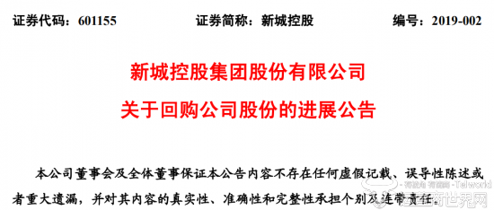 据了解,新城控股于2018年11月13日披露了《关于以集中竞价交易方式回购股份的回购报告书》。2018年11月20日,新城控股实施了首次回购股份。