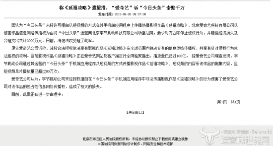 实际上,今日头条还曾在2018年9月被爱奇艺起诉,起诉缘由为今日头条擅自以短视频的方式在其手机端应用程序上传播热播影视作品《延禧攻略》,侵犯了爱奇艺的作品信息网络传播权,要求赔偿经济损失及合理支出共计3000万元。