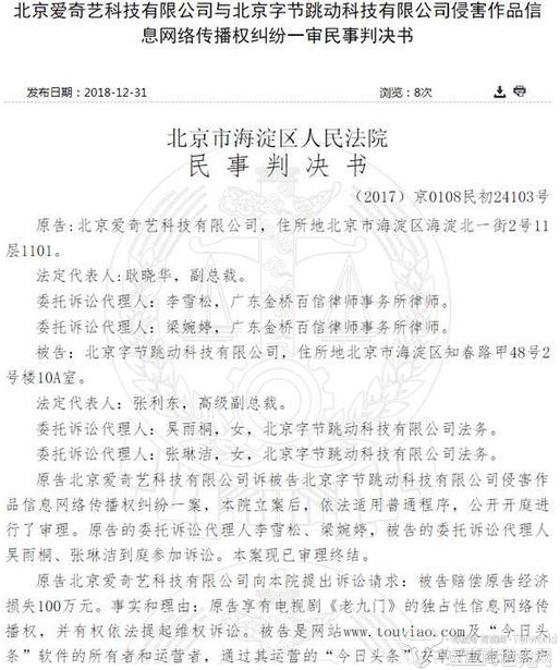 近日,根据北京市海淀区人民法院判决书,今日头条因侵权播放爱奇艺独家网络传播剧《老九门》被判赔偿6万元。而这已经不是今日头条第一次因为版权问题被告上法庭了,这也足以看出今日头条在版权方面的不重视。