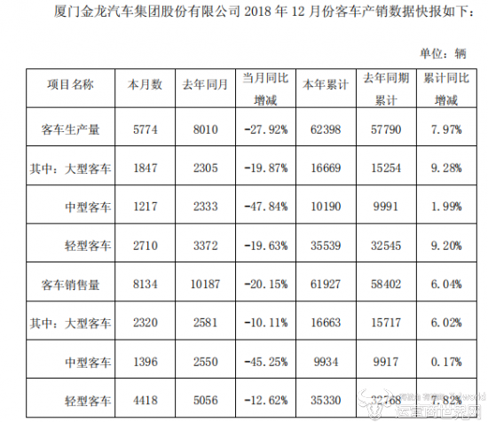 运营商世界网讯,2019年1月8日,厦门金龙汽车集团股份有限公司(以下简称“金龙汽车”)发布了2018 年 12 月份产销数据快报。
