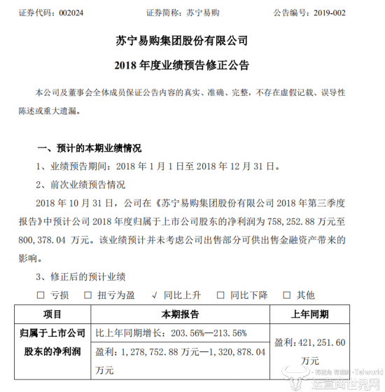 1月9日,苏宁易购发布了2018年度业绩预告修正公告,之前苏宁易购公布了一份业绩预告称归属于上市公司股东的净利润最高可达80亿,但是今天的预告显示净利润可超百亿,这是为何呢?