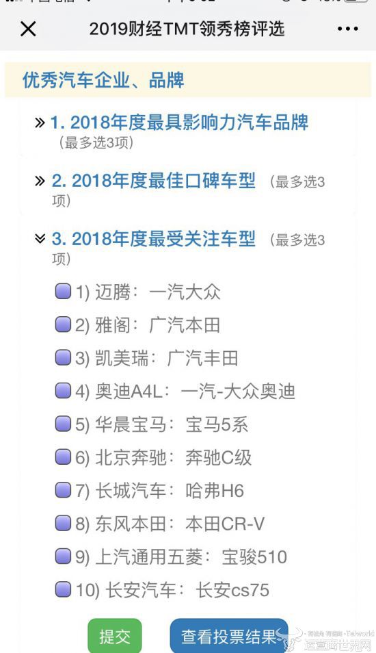 近日,运营商世界网宣布首届“财经TMT行业领秀榜汽车评选”正式开启。企业和用户可通过微信搜索关注“运营商世界”公众号进行投票,也可扫描下方二维码关注账号,在底部菜单栏找到投票系统进行投票,每人每天都可投一票。