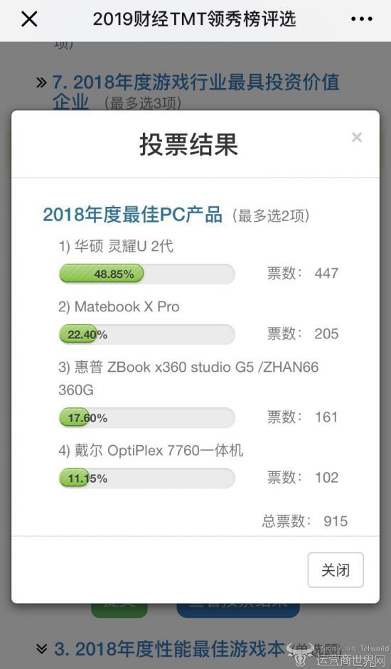 同时,截止1月10日16点43分,华硕灵耀U2代以447票居于年度最佳PC产品奖投票榜第一名,华为Matebook以205票排在第二,后面依次是161票的惠普和102票的戴尔。
