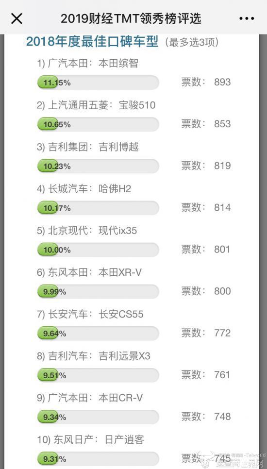 据查询,本次入选2018年度最佳口碑车型候选名单的有10款车型,分别是宝骏510、本田XR-V、哈佛H2、本田缤智、吉利远景X3、吉利博越、日产逍客、本田CR-V、长安CS55和现代ix35。显然,今年最经典的10款车都进入了候选。