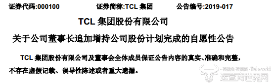 公告显示,TCL集团于2019年1月15日收到董事长李东生的通知,通知称李东生先生已于2018年12月20日至2019年1月15日通过集中竞价的方式增持公司股票934 万股,共计2508 万元,增持计划已实施完成。