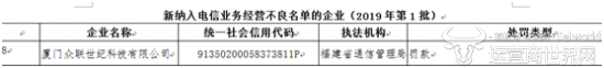 2019年1月16日,厦门众联世纪科技有限公司再次被纳入电信业务经营不良名单,并予以罚款。