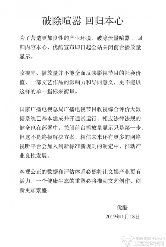 1月18日,优酷发表题为“破除喧嚣、回归本心”的声明,宣布即日起关闭前台播放量,据悉,旨在破除流量喧嚣,回归内容本心,营造更加良性的产业环境。