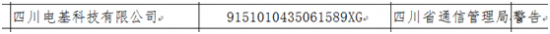 2019年1月16日,工信部发布29家违规企业被纳入电信业务经营不良名单。其中,四川电基科技有限公司被列入不良名单企业之一。据悉,此次四川电基科技有限公司已被四川省通信管理局提出警告。