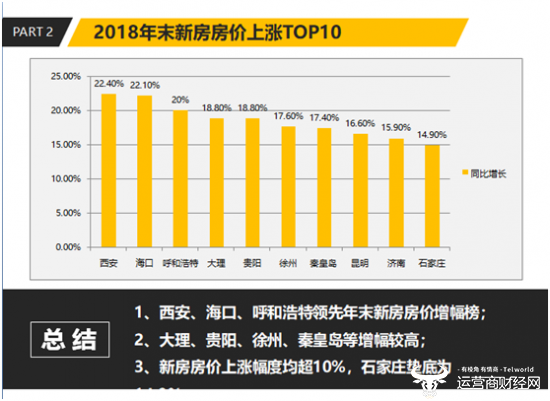 近日, 2019中国财经TMT行业“领秀榜”盛典如期举行。运营商财经网在大会上发布了2018年房地产行业报告,列出了2018年末新房房价上涨TOP10城市榜单,众多炙手可热的城市位列其中。看来2018年多达四百于次的严密调控依然阻挡不了房价的高涨。