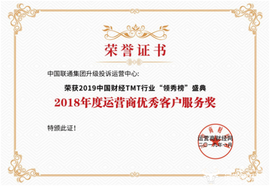2019年1月20日,运营商世界网在北京举办第三届TMT财经行业盛典。本次盛典,中国联通集团升级投诉运营中心荣获“2018年度运营商优秀客户服务奖”。该奖项在业界受到企业关注、认可和推崇,也是衡量运营商客户服务专业性和权威性的重要标杆。