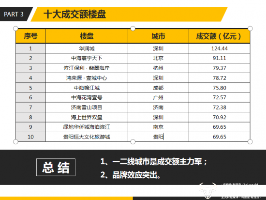 而列入前十名的楼盘所在的城市包括北京、深圳、广州、杭州、成都、济南、南京、贵阳。其中,深圳的华润城以124.44亿元的成交额位列第一,贵阳的贵阳恒大文化旅游城以69.65亿元的成交额排在第十位。
