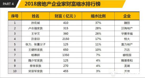 报告指出,2018年房地产企业家财富缩水前十名分别为融创中国孙宏斌、泛海地产卢志强家族、华夏幸福王学文、恒大地产许家印、富力地产张力张量父子、万达集团王健林家族、碧桂园杨惠妍、隆基泰和魏少军家族、龙湖集团蔡奎家族及龙湖集团吴亚军家族。