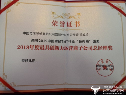 1月20日,由运营商财经网主办的2019年财经TMT领秀榜盛典暨运营商世界网更名发布会在北京召开。会上,颁发了2019年财经TMT领秀榜,中国电信四川公司凭借骄人的发展业绩,荣获“2018年度优秀运营商省公司奖”、“2018年度运营商优秀新闻暨品牌传播力奖”两项大奖。中国电信四川公司总经理郑成渝荣获“2018年度最具创新力运营商子公司总经理奖”。