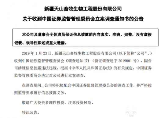 2019年1月23日,新疆天山畜牧生物工程股份有限公司(以下简称“天山生物”)发布一则公告称收到了中国证券监督管理委员会立案调查通知书,究竟是为何事呢?