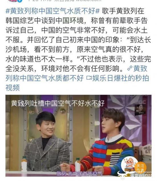 网友们当然是很生气,毕竟黄致列在中国赚了很多钱,而且他这个言论有夸大的成分。作为艺人,黄致列喝的一定是矿泉水,不仅如此,他还参加的湖南卫视节目,去的都是山清水秀的小山村。虽然黄致列道歉的速度倒是挺快的,但网友们并不认账,就连韩国知名博主都公开吐槽他这个举动过于“白眼狼”!
