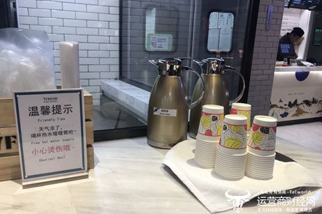(7FRESH店内可供往来顾客自取的冷热水和一次性纸杯)
