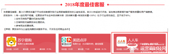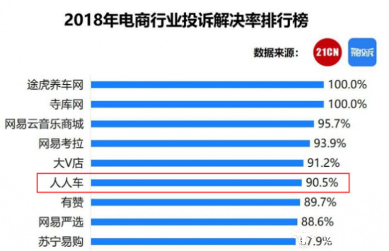 21CN聚投诉是国内最大的消费投诉公开信息数据库,由其发布的年度投诉报告是检验商家对用户问题重视程度及执行力的试金石,自2014年起开始评选的“年度最佳客服”,旨在通过媒体及公众监督推动商家提升客户服务质量和用户满意度。在2018年度的“电商行业投诉解决率排行榜”上,人人车以90.5%(投诉共计222件,解决201件,统计周期为2018年1月1日至2018年12月31日)的投诉解决率排名第六,成为唯一进入该榜单TOP10的二手车电商平台。