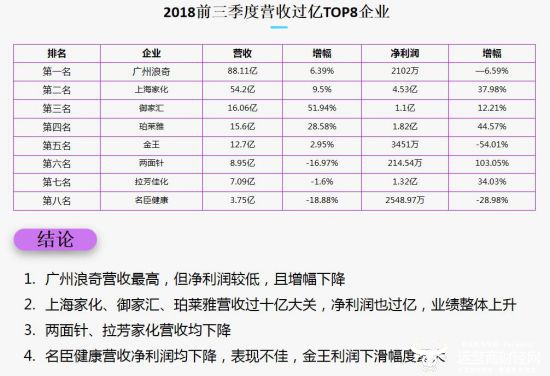 根据报告可以看出,2018年前三季度营收排名前八的日化企业分别为广州浪奇、上海家化、御家汇、珀莱雅、金王、两面针、拉芳家化、名臣健康;其中广州浪奇的营收最高,为88.11亿,同比增长6.39%;突破十亿大关的企业有五家。