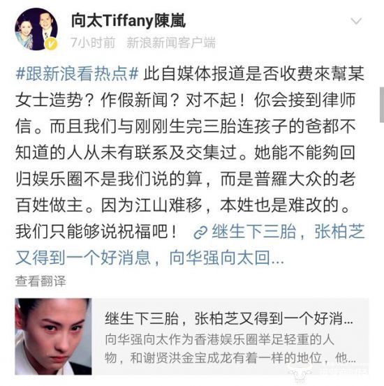 近日,沉寂已久的张柏芝通过第三胎重回大众视线,而她当年被向华强向太封杀的事情也被重提。对于此种消息,向太也在社交媒体做出了公开回应。