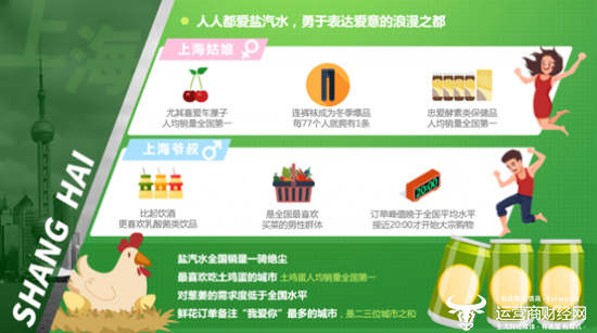 在上海,盐汽水成为了男女老少皆爱的首选饮料,年度销量位居全国首位。上海居民在鸡蛋的选择上,格外喜爱好脂肪跟胆固醇的含量更丰富的土鸡蛋,人均销量全国第一。女性消费者人均车厘子销量全国第一,酵素类保健品人均销量全国第一,足见在上海生活的女性非常注重生活的品质与个人健康的护理。此外,上海也是在鲜花订单中备注“我爱你”最多的城市,达到了二三位城市之和,是名副其实的勇于表达爱意的浪漫之都。