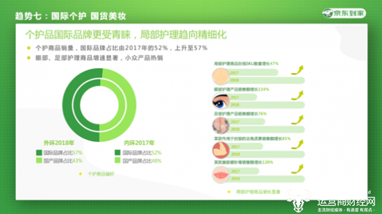 个护类商品中,国际品牌更加受到消费者的青睐,国际品牌的销量占比上升了5%。国民对身体护理也更加注重精细化,局部护理商品的SKU数量增长达47%。眼部护理产品销售额增长134%,而看似小众的商品,如某款肘部去角质产品,销售额也大增85%。愈发精细化的个人护理,也印证了在消费升级下,国民对生活品质追求的不断提升。