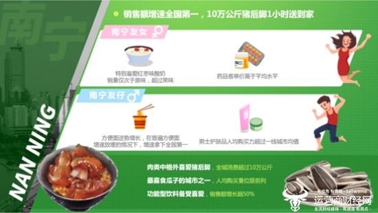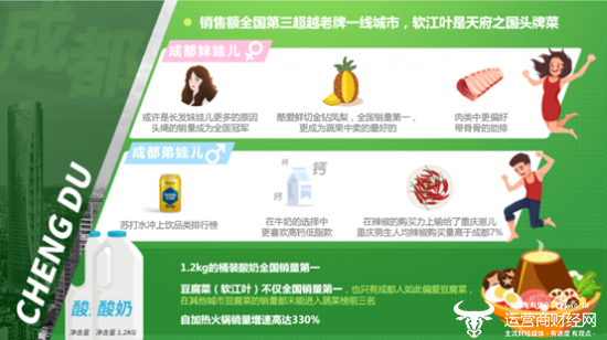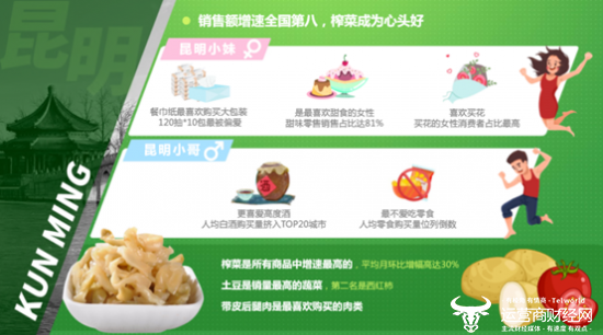 成都作为新一线城市的代表,2018年全年销售额位于全国第三,超越了老牌一线城市。成都人俗称“软江叶”的豆腐菜,销量是全国所有城市的第一名,也只有成都人如此偏爱豆腐菜,这种蔬菜在全国其他城市的销量都未能进入前三名。超辣火鸡面是天津人民的2018第一单品,某款火鸡面在天津销量超过一千万桶。南宁作为销售额增速全国第一的城市,消费了超过10万公斤猪后脚,也是最喜欢嗑瓜子的城市之一,人均购买量位居前列。春城昆明是销售额增速全国第八位的城市,榨菜是所有商品中增速最高的,月均环比增幅高达30%。
