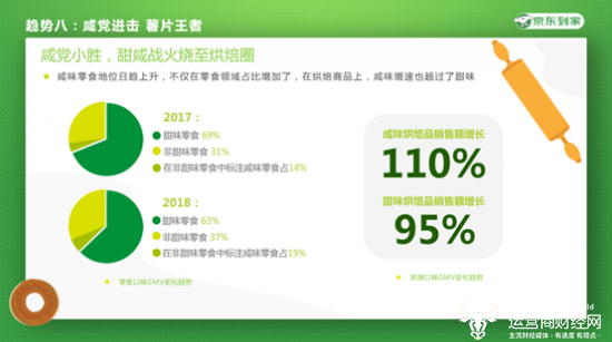 零食领域,甜食一直拥有绝对优势,但数据显示,在不同口味的零食销售额占比上,咸味占比由2017年的14%上升至19%,似有逐步撼动甜食霸主地位的趋势。这一趋势甚至蔓延至烘焙领域,咸味烘焙品以110%的销售额增长超越甜味烘焙品的销售额增幅。