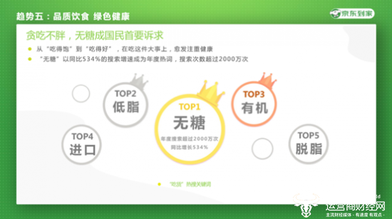 此外,《报告》显示,“无糖”成为在与吃相关的第一热搜词,全年搜索量高达2000万次。而排在其后的热搜词分别为低脂、有机、进口、脱脂,足见贪吃不胖、品质健康,已成为国人在吃上的头等大事。