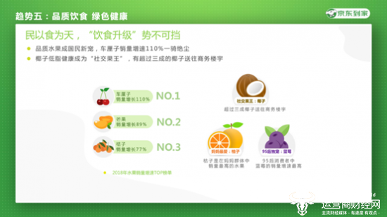 国民收入走高,在水果选购上也愈发青睐高品质水果。车厘子作为高价水果成为了2018年销量增速最高的水果,2018年卖出的车厘子较2017年增长110%。95后对水果的选择更加不在意价格,蓝莓成为95后消费者中销量增速第一。椰子也早已不再是印象中的“小众水果”,低脂、健康的特性,让其成为名副其实的“社交果王”,有超过3成的椰子被送往商务楼宇。